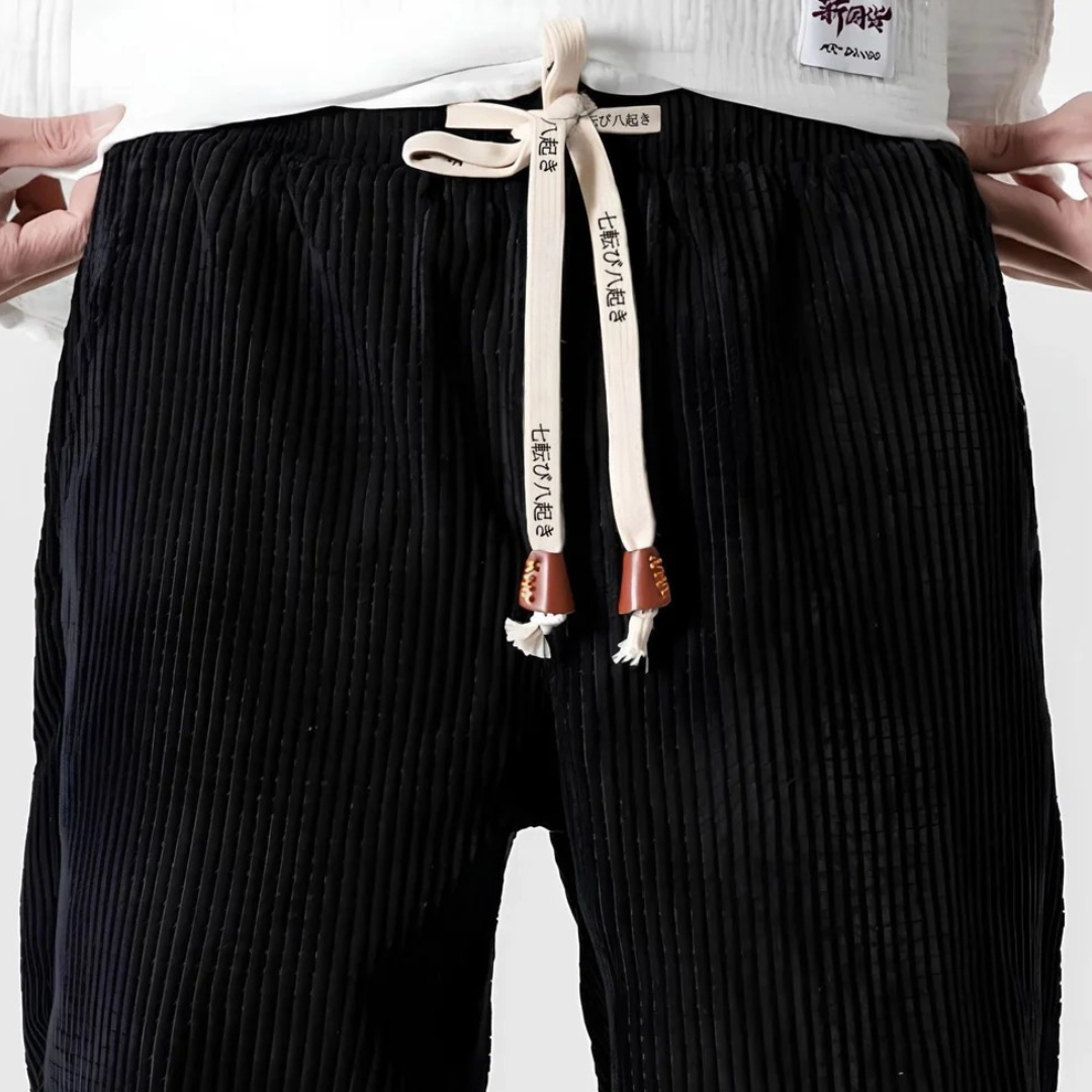 Domina el arte del confort japonés con nuestros pantalones de pana Jitsu. Disfruta de una cintura elástica cómoda y de inscripciones japonesas en los cordones de algodón.